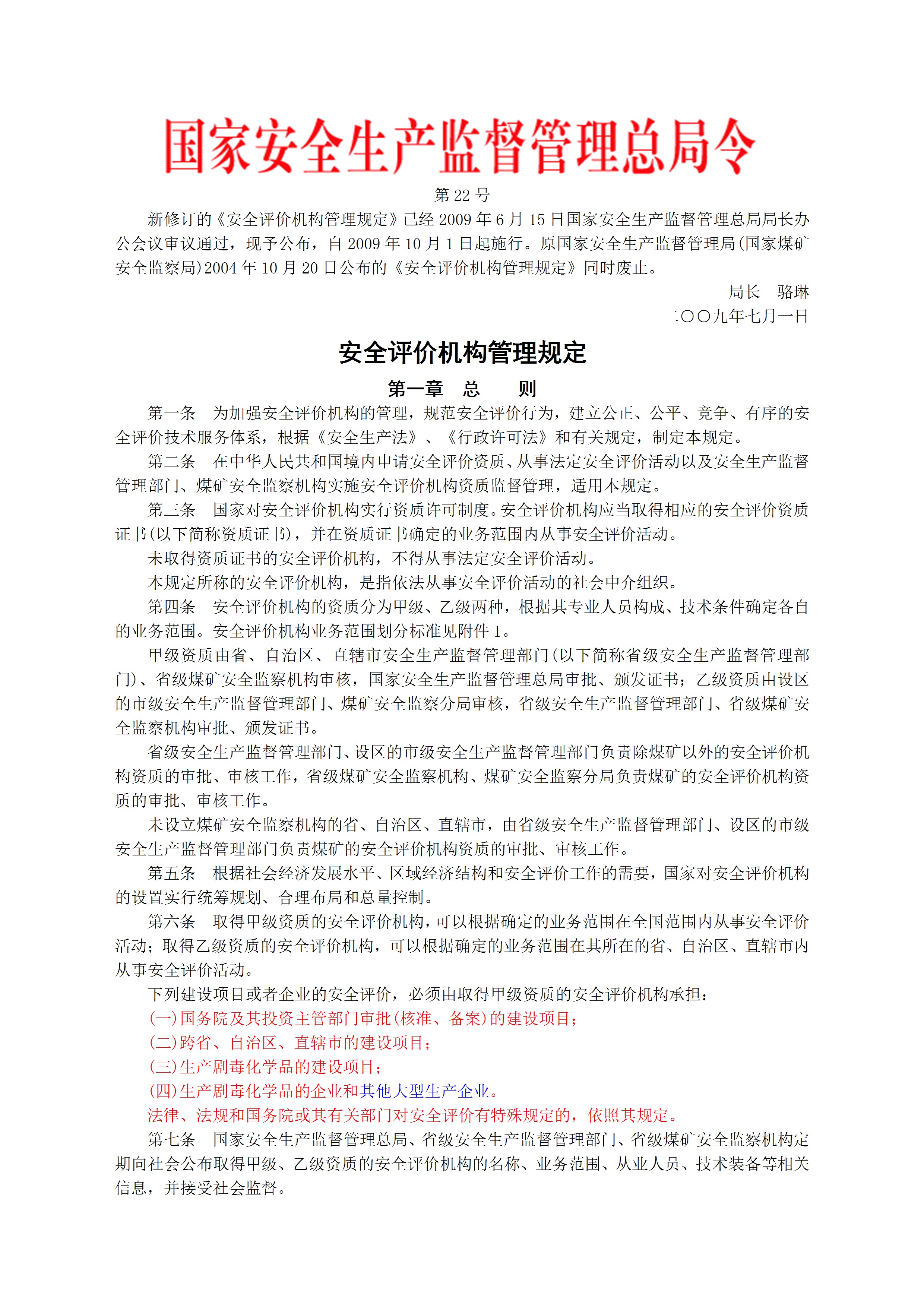 安监总局令[2009]第22号_安全评价机构管理规定安监总局令[23]第63号修改