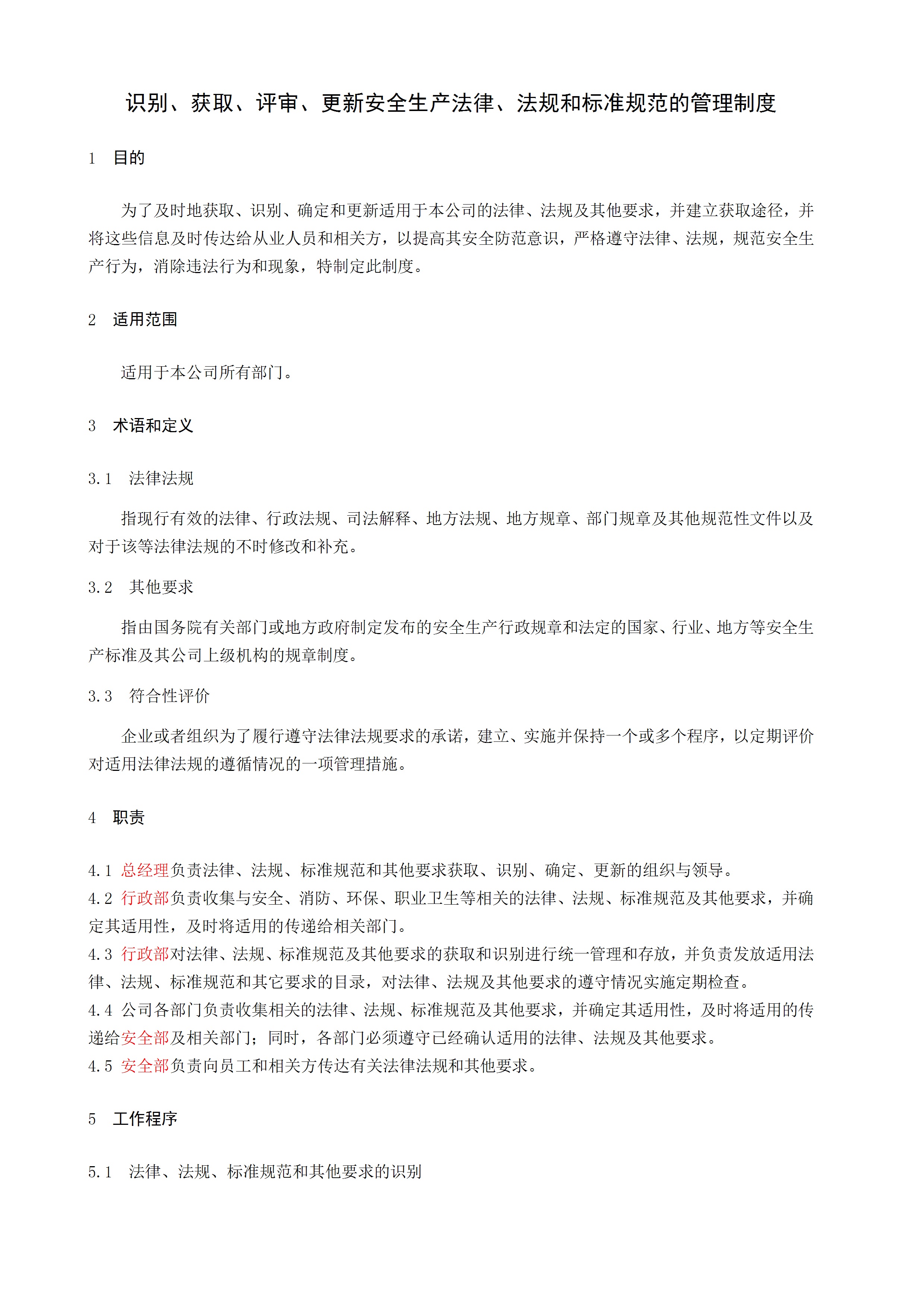 识别和获取适用的安全生产法律法规,标准及其它要求管理制度(4-1)[文档]
