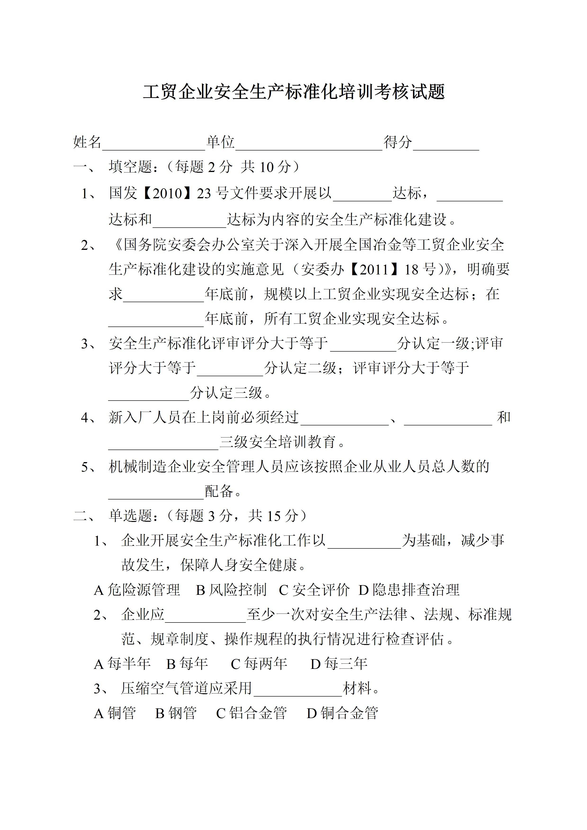 / 安全生产标准化培训考核试题