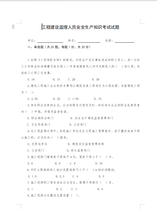 / 工程建设监理人员安全生产知识考试试题
