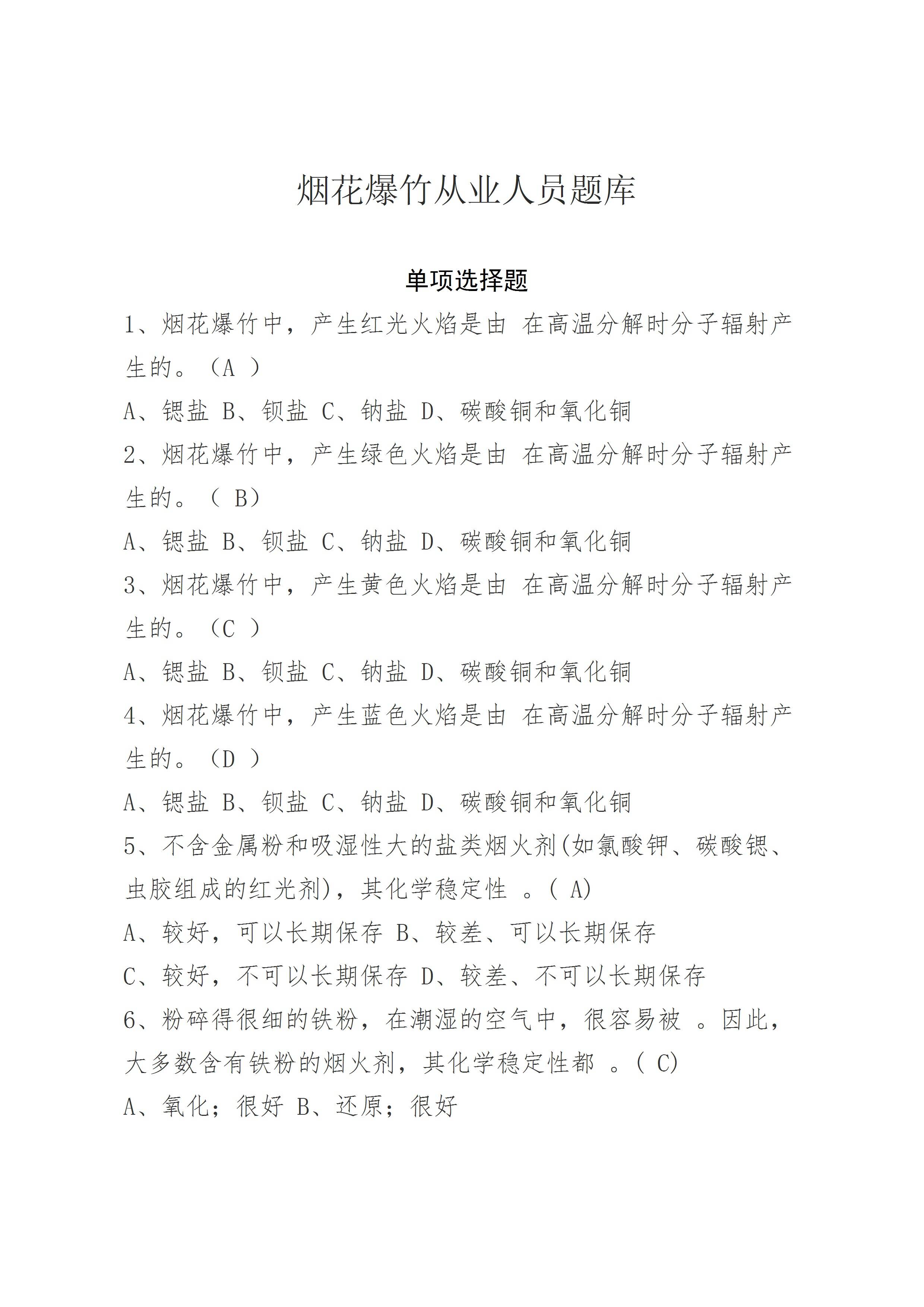 / 烟花爆竹从业人员题库单选题