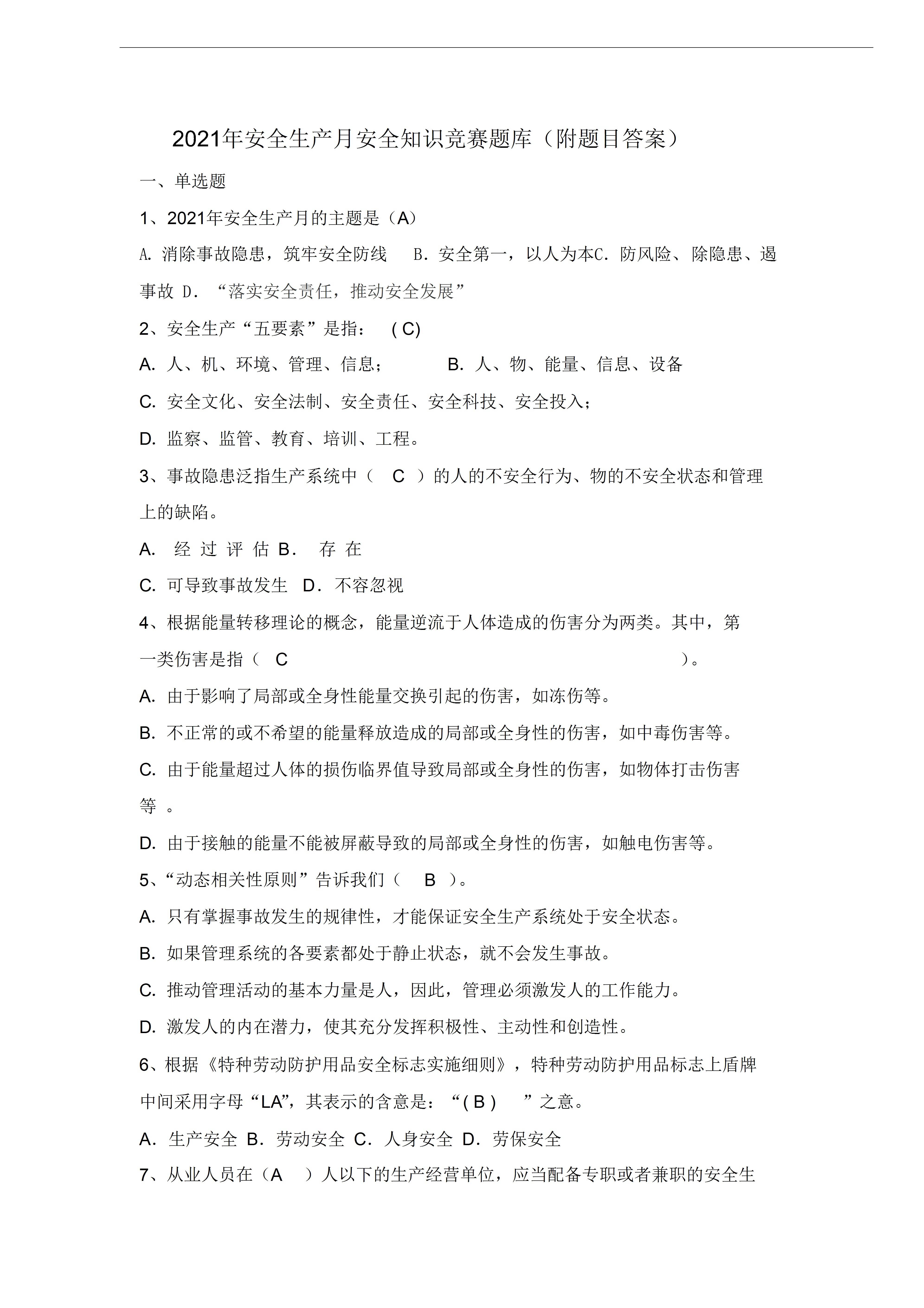 2021年安全生产月安全知识竞赛题库(附题目答案)