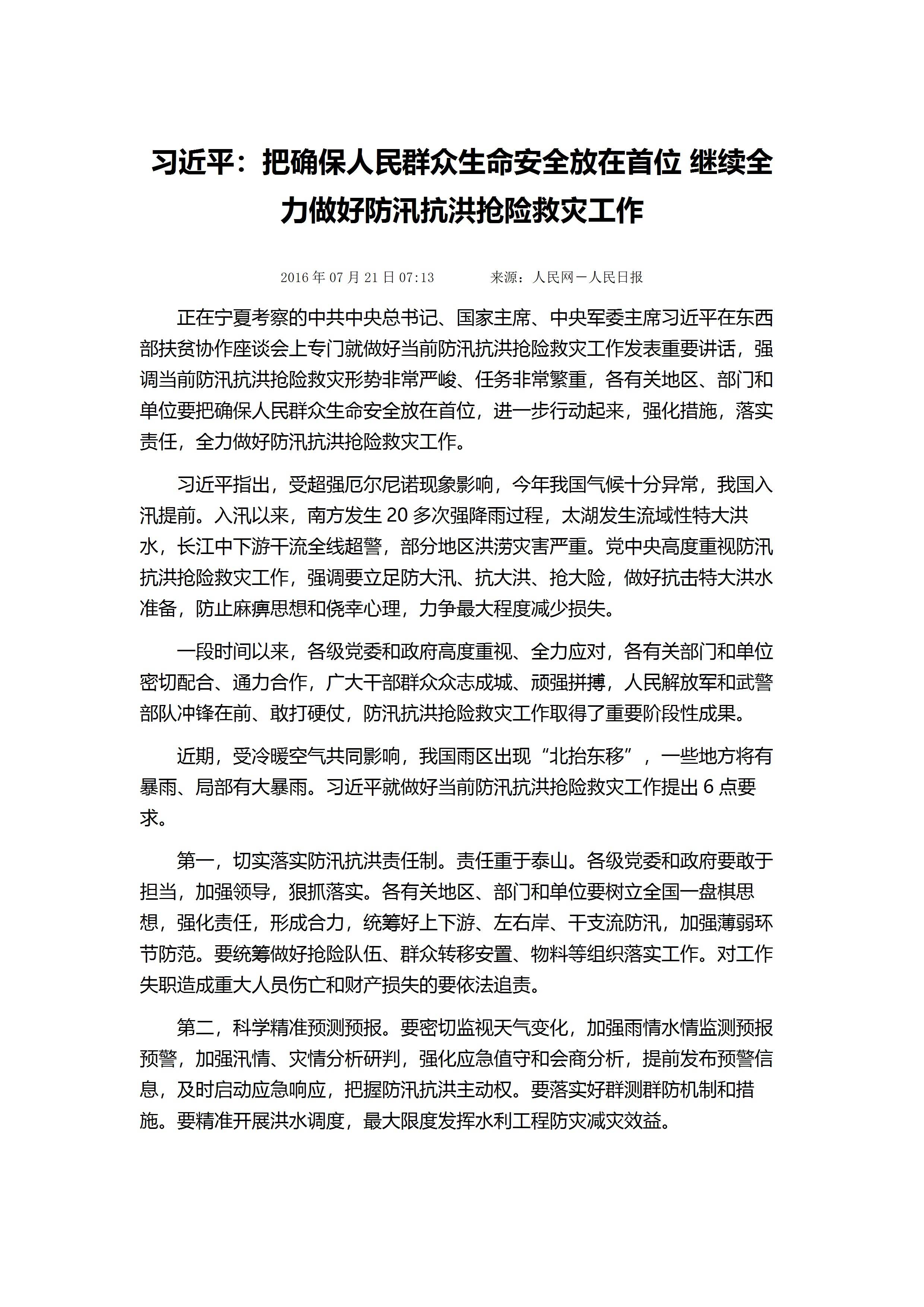 2016年7月习近平在东西部扶贫协作座谈会上专门就做好防汛抗洪抢险救灾工作发表重要讲话[文档]