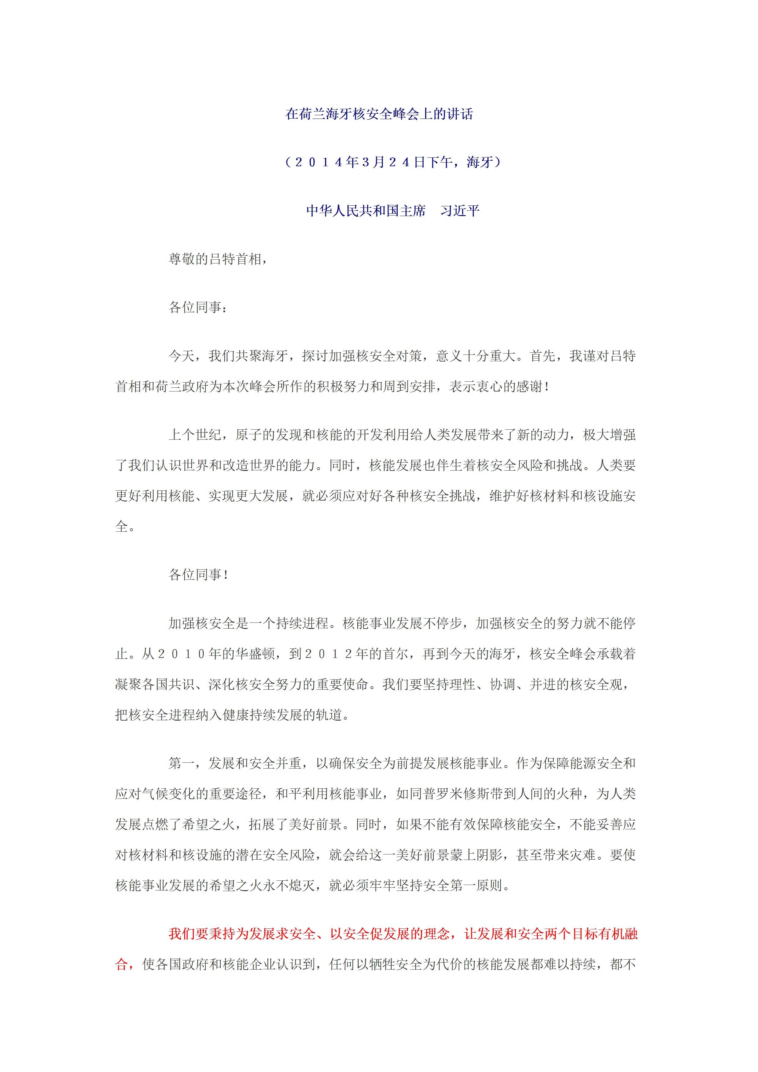 / 2014年3月25日在荷兰海牙核安全峰会上的讲话[文档]