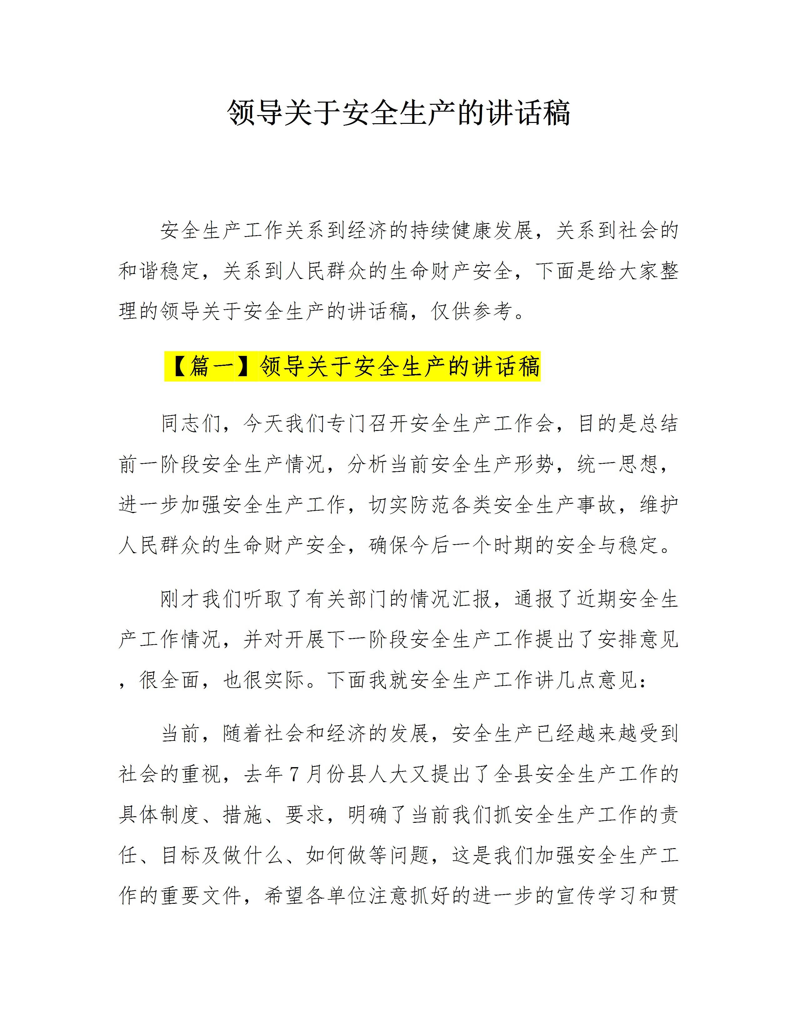 / 领导关于安全生产的讲话稿汇编(30页)[文档]